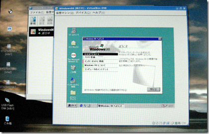 (6)Windows 98システムファイルのコピーや設定がひと通り終わり、最後の再起動と言う段階で、固まってしまった。これは前回も同じだったので、VirtualBoxメニューから強制的に「閉じる」を選択。VirtualBoxに戻ったら、「起動」、出て来たメニューからハードディスクから起動を選択してEnterを押すと、Windows 98のロゴが出て、ファイルの読み込みが始まった